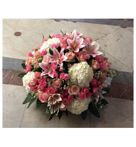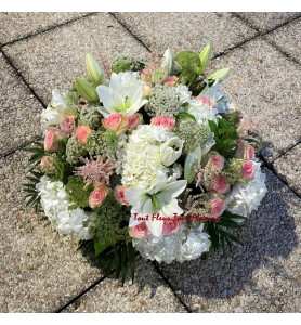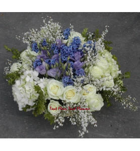160,00 €Coussin rond dans les tons blancs, bleus, violines, parmes ... et dégradé de bleus en fonction des fleurs de saison