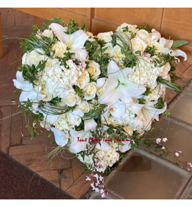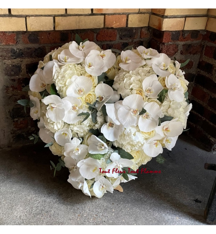 Coeur composé de fleurs variées blanches et feuillages de saison