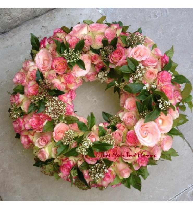 Couronne à poser à base de roses roses. Peut être décliné en d'autres couleurs de roses; Monochrome ou multicolore. Nous appeler ou nous le préciser sur la commande
