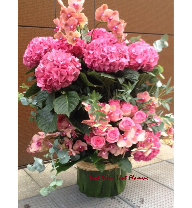 Composition en hauteur de fleurs choisies style Roses, Hortensias, Orchidées ...
