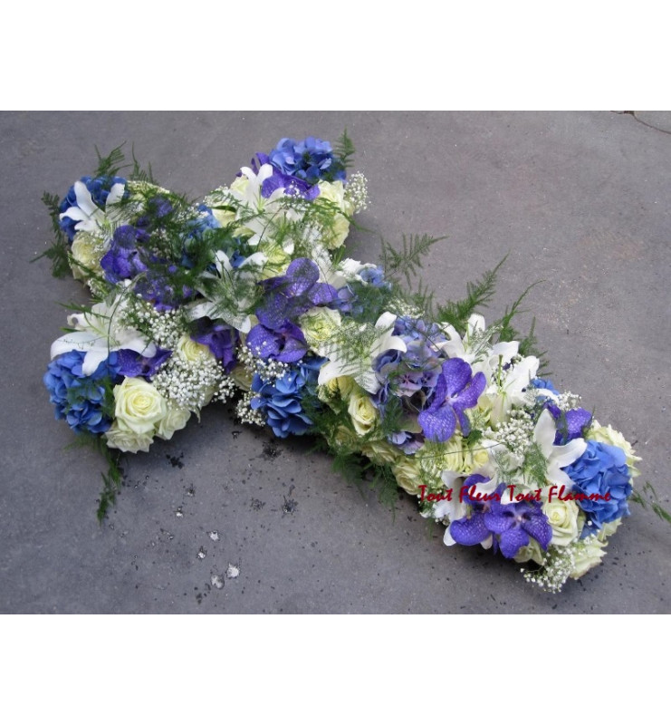 Croix de fleurs blanche et un dégradé de bleu, mauve, violet ...