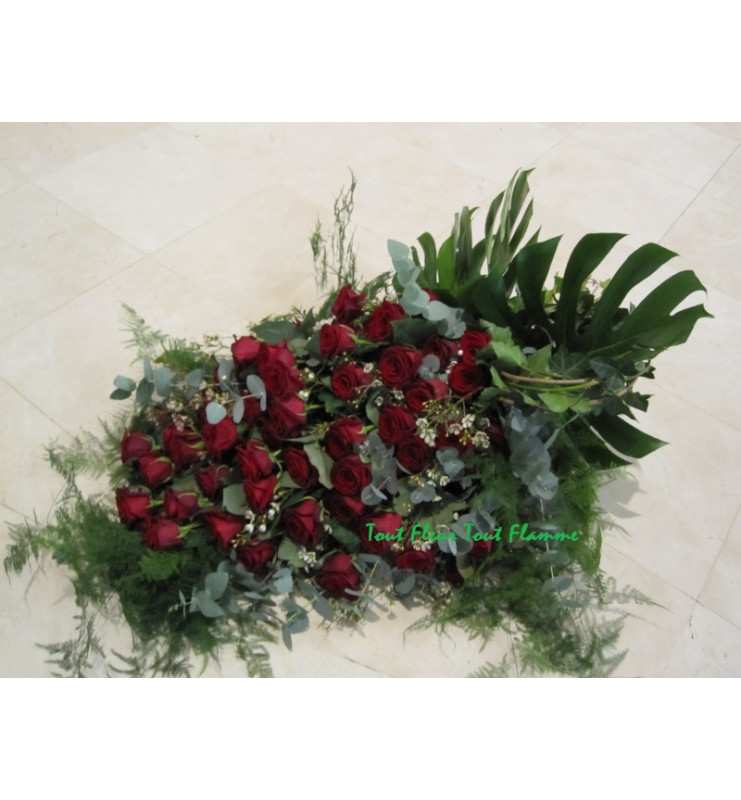 Bouquet allongé de roses et feuillages. Couleur(s) au choix